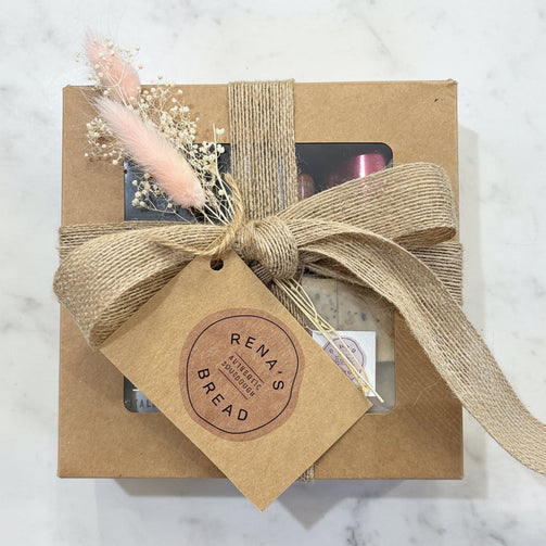 Rena's Bread Purim Mishloach Manos gift box featuring Spelt Sourdough crackers, can of Moscato sparkling wine, and premium salted nuts, packaged in a rustic kraft box with a window.